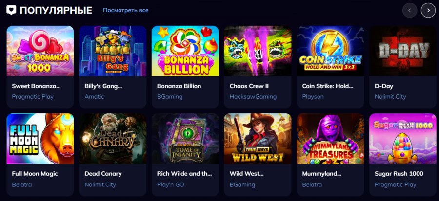 Производители Novomatic, Spinomenal, Belatra, Amatic, Igrosoft, Playtech, NetEnt, Microgaming, Red Tiger, Endorphina, NetGame, Evoplay, Betsoft, Ezugi, Push Gaming, Onlyplay, Mascot и другие